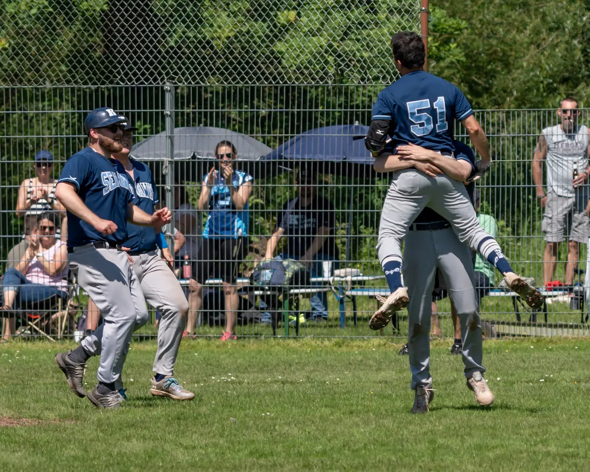 Keinen unserer Fans hält es mehr auf seinem Platz, alle Spieler im Dugout stehen am Zaun. Der Verteidiger schnappt sich direkt den Ball um unseren vordersten Läufer an der dritten Base aus zu werfen — Wurf — daneben. Freddy nimmt ebenfalls die Beine in die Hand, umrundet die dritte Base und flitzt über die Platte für den entscheidenden letzten Punkt. Was für ein Arbeitssieg nach 8 Innings inklusive Walk-Off.