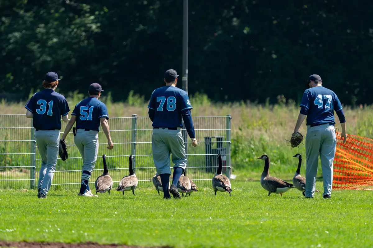 Einen kleinen Einwand hatten die Kanadagänse im ersten Inning jedoch und gesellten sich spontan im Leftfield dazu. Mit vereinten Kräften und musikalischer Begleitung von unserem Stadionsprecher und DJ Howie wurde das Dutzend vom Platz begleitet.
