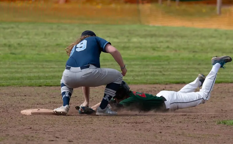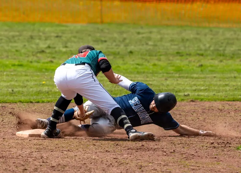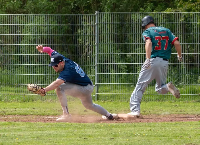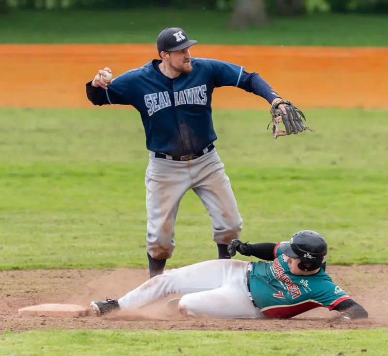 Nachdem die Kieler im 6. Inning. noch einen weiteren Run durch Torge Laglers RBI-Single machten, schien der Sieg schon fast sicher. Christopher Schmidt auf dem Mound lies schließlich die letzten Innings kaum Baserunner zu. Seine sehr abwechslungsreichen Würfe und außergewöhnlichen Pitchbewegungen brachten die Dohrener zum verzweifeln. Nun allerdings kam das 7. Inning. Zwei Basehits der Gäste ließen sowohl die Zuschauer als auch die Seahawks nervös werden. Runner auf 1st und 2nd Base. Nun stand also der Ausgleichspunkt auf der ersten Base. Es folgten zwei wichtige Flyouts durch Mike Königs und Jean Carlos Sabe im Outfield. Jetzt galt es, nur noch ein Aus zum Sieg. Christopher Schmidt, versuchte seinen besten Pitch auszupacken, welchen Dohrens J.Bergmann aber zu einem weiten Flyball in die Nähe des Rightfielszaunes beförderte. Alle Spieler beider Mannschaften blickten ins Rightfield. Ein langer Weg für Kiels Centerfielder Königs, ein vielleicht noch längerer für Rightfielder Bartel. Letzterer ‚callt‘ den Ball, springt waagerecht durch die Luft, und…… catch. So jedenfalls dachten alle, bis Larsson auf den Boden landete, und plötzlich der Ball auf den Rasen rollte. Also doch kein Catch. Dohrens Baserunner wetzten derweil um die Bases, in der Hoffnung den Ausgleichspunkt zu erzielen. Kiels Rightfielder schaltet schnell, wirft den Ball zum herausgelaufenen Second Baseman Lagler, dieser zum Cut-Off Freddy Ibs. Ein Moment, vor Spannung kaum zu überbieten. Inzwischen hat der Runner vom Second Base schon gescort, Ibs dreht sich zur Homeplate und sieht den Runner, der vom First Base kommt. Er wirft den Ball zum Catcher Busch welcher den Tag macht und…. OUT!!!!