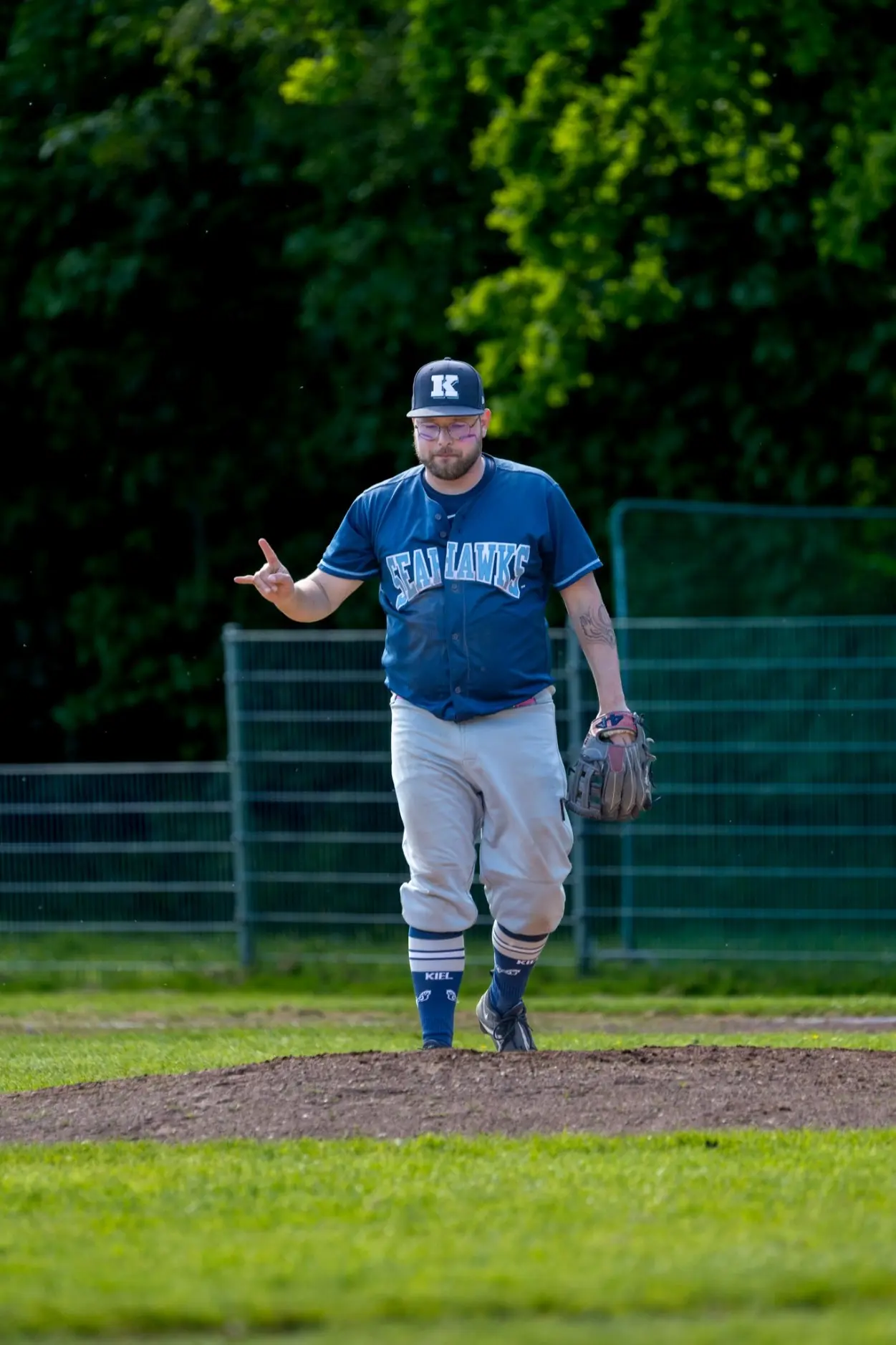 Nach 2 Punkten im ersten Inning und einem Punkt im zweiten Inning durch die Seahawks konnten wir im zweiten Spiel nicht durch starkes Hitting glänzen. Oguz von den Knights, der schon im ersten Spiel als Reliever 2,2 Innings gepitcht hatte, warf auch das zweite Spiel komplett durch, was deutlich die nachlassende Konzentration der Seahawks am Schlag widerspiegelt. Leider wurde noch zu oft zu früh geschwungen.
