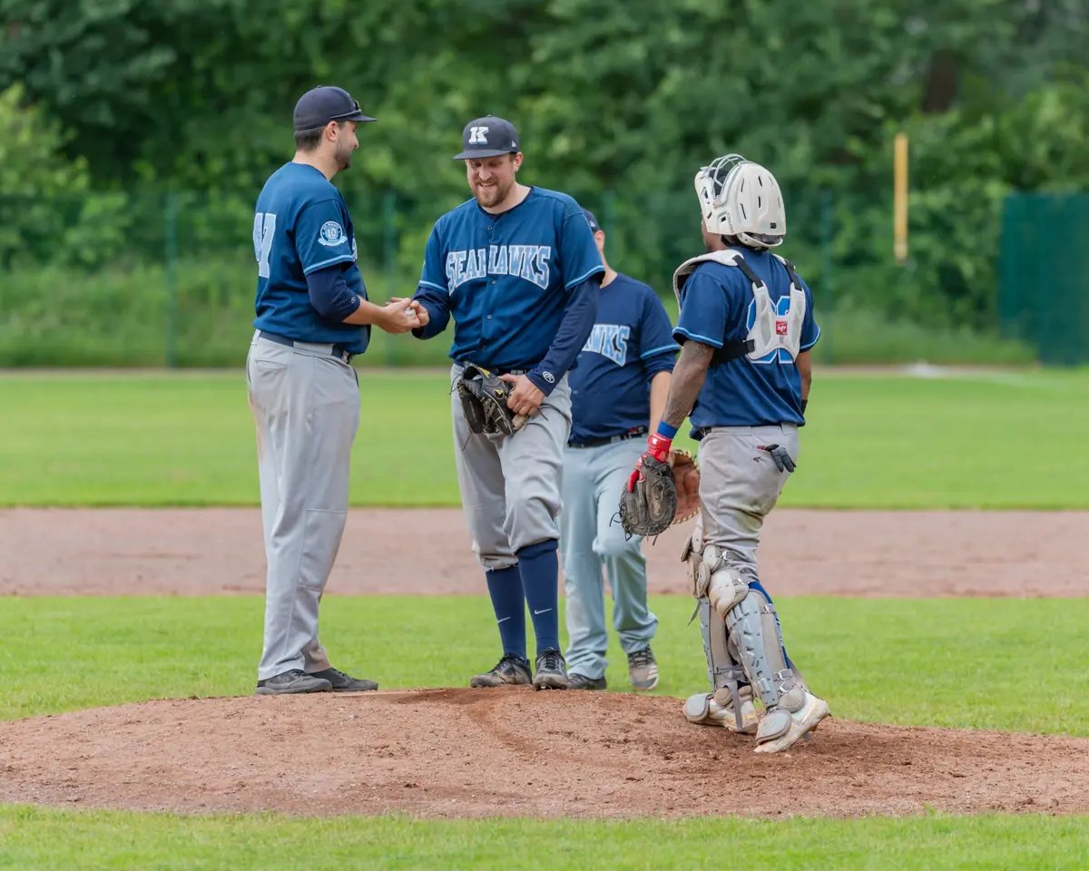 Zu Beginn des ersten Spiels schien der vorbereitete Gameplan für die Offensive, welcher auf Geduld am Schlag beruhte, voll aufzugehen. Nach drei gezogenen Walks von Yanez Molina, Schmidt und Busch sowie einem Hit by Pitch an Coy stand es nach dem Top des ersten Innings prompt 1:0 für die Kiel Seahawks. So kann es weitergehen! Doch auch die Offense der Berlin Roadrunners schien bemüht, eine passende Antwort gegen die Defense der Kiel Seahawks und deren Starting Pitcher, Christopher Schmidt, zu finden. Der erste Baserunner, welcher einen Blooper hinter den First Basemen haute und danach ein erfolgreiches Steal verbuchen konnte, scorte im Laufe des Innings, sodass das Spiel nun auch auf dem Scoreboard wieder ausgeglichen war. Anders als die schwüle Luft im Ballpark der Roadrunners, brauchte die Offense der Kiel Seahawks danach jedoch etwas Zeit um auf Betriebstemperatur zu kommen. Die Offense konnte in den vier darauffolgenden Innings keinen Run und lediglich drei Baserunner verbuchen. Durch sehr solides Pitching von Christopher Schmidt, welcher ein Complete Game mit fünf Strikeouts warf, war der Sieg des Spiels im Top des sechsten Innings, als die Seahawks 1:3 zurücklagen, jedoch noch immer in greifbarer Distanz. Diese Einstellung konnte man im sechsten Inning jedem Schlagmann anmerken und so schafften es die Seahawks unglaubliche 12 At-Bats zu verbuchen. Neben Walks und einem weiteren Hit by Pitch an Coy konnten die Seahawks in diesem Inning auch fünf Hits erschlagen, von welchen der erste Homerun der Saison von Ibs sicherlich das Highlight war. Endresultat nach dem Top des sechsten Innings: 10:3 für die Kiel Seahawks. Und auch wenn die Berlin Roadrunners es im Bottom desselben Innings noch schafften einen Run zu scoren, schafften es die Seahawks den Sieg souverän über die Ziellinie zu bringen. Endresultat Spiel 1: 10:4.